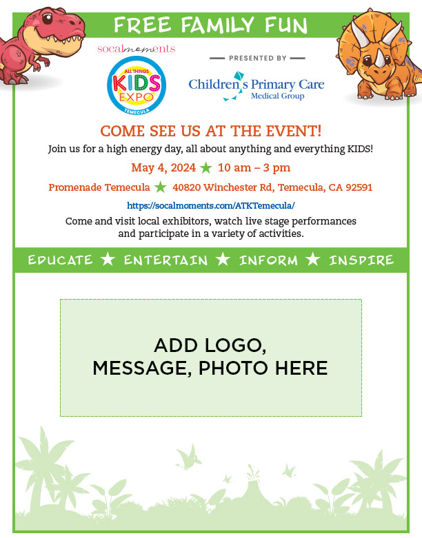 Visit our booth at this Saturday’s All Things Kids Temecula at the Promenade Temecula. Come and join the fun with live entertainment, activities, games and raffle prizes! Go to socalmoments.com/ATKTemecula/ for the latest details.